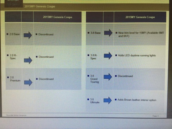 Hyundai is reportedly dropping the four-cylinder turbo model, and since it is highly unlikely that they offer a V8 version, that means the 2015 Hyundai Genesis Coupe will only be available with a V6 engine. And it seems it’s the old 3.8 liter GDi V6, and not the new 3.3 liter turbo V6 we saw in the HND-9 Concept.