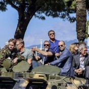 Here’s a few pictures of the 585 horsepower Mercedes S63 AMG Coupe on display at Cannes. Also, there is a shot of the Expendables crew rolling into Cannes on a tank. This must have been Arnold’s idea.
