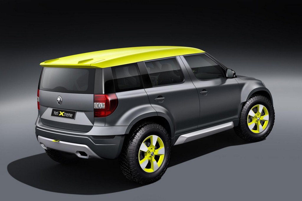 The design of Skoda Yeti Xtreme is inspired by rally cars with a matte grey body and bright yellow-green roof and 17-inch rims. It has tinted windows and revised bumpers with large air intake and LED headlights, as well as new sills and modified wings. The rally theme continues inside, with 4 individual Recaro sports seats with integrated four-point safety belts. Other features include the ‘Super Sport’ steering wheel with integrated gearshift paddles.