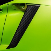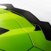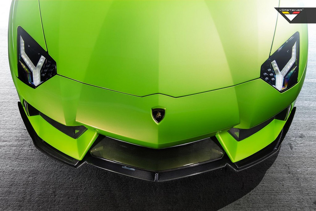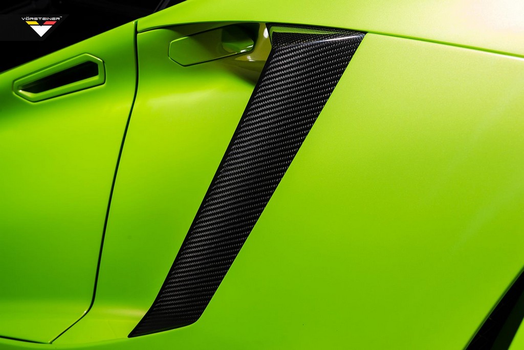 But there is more to the Vorsteiner Lamborghini Aventador Hulk than a few buckets of paint. The car is fitted with a full set of Aventador-V styling kit which includes a front splitter with little winglets on the sides, aerodynamic side skirts, a revised diffuser, and a Batman-style fixed rear wing.