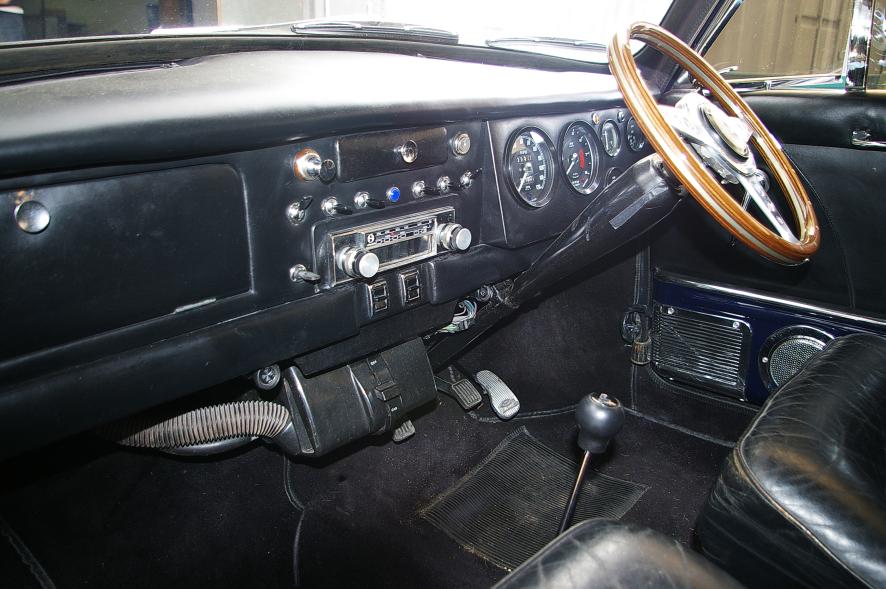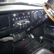 Inside the cabin you find Aston Martin DB6 leather seats, electric windows with Aston Martin window switches, Rolls Royce chrome handles, dark blue leather-trimmed carpets, Britax seat belts, a full width dashboard housing MGB rev counter and odometer and Jaguar auxiliary instruments, a Moto-Lita wood rim steering wheel and even a Rolls Royce cigarette lighter.