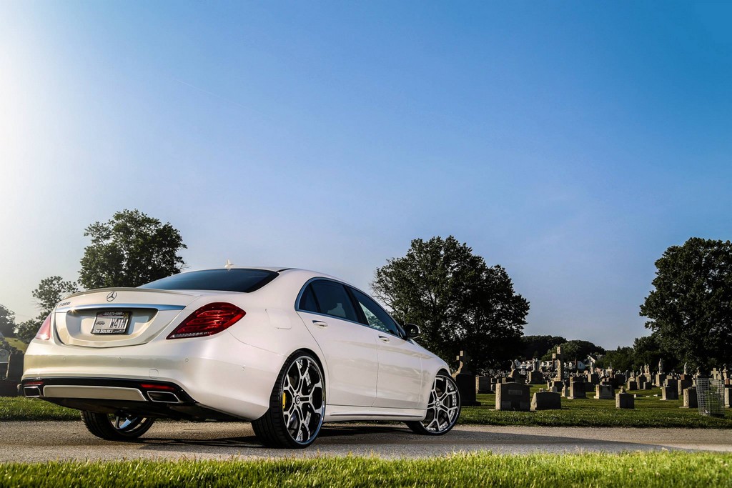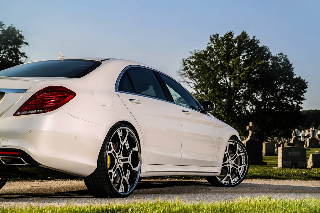 This Mercedes S-Class with Forgiato GTR wheels is a W222 S550 model, meaning it is powered by a 4.6 liter V8 engine developing 455 hp and over 700 Nm of torque, mated to a standard 7G-TRONIC PLUS automatic transmission with DIRECT SELECT. This big luxury sedan can accelerate from 0 to 60 mph in 4.8 seconds and has a limited top speed of 155 mph.