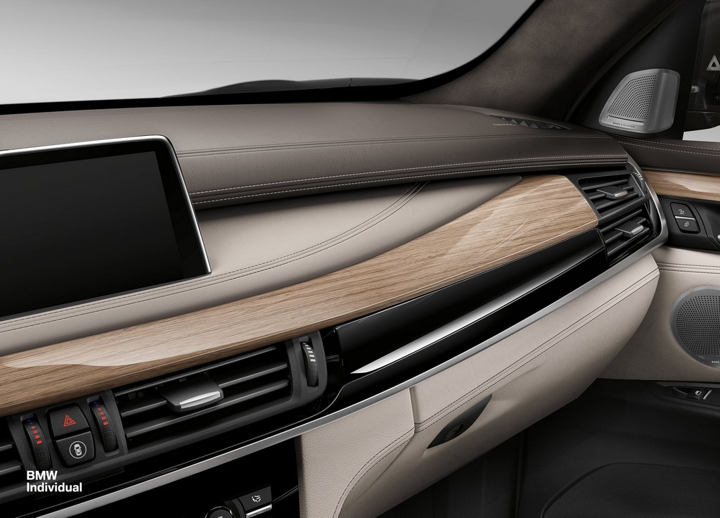 Inside, 2015 BMW X6 Individual feels like an exclusive bar, what with the fine-grain Merino leather Taupe, instrument panel finished in fine-grain Merino leather Scotch, Alcantara roofliner in Scotch Dark and fine-wood trim Sen Light Brown. The leather upholstery can be had in Criollo Brown, Nutmeg, Amaro Brown and Smoke White.