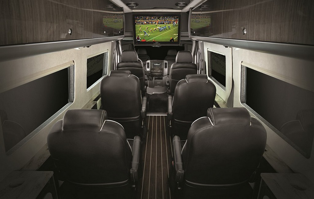 Opening the power entry sliding door of the Airstream Autobahn, you enter a lavishly-equipped and nicely-appointed interior that features durable wood trim, leather seating, dual refrigerators and individualized controls. Passengers also enjoy other amenities such as power footrest, heated seating and power outlets (120v and USB) along with a workspace equipped with a functional desk.