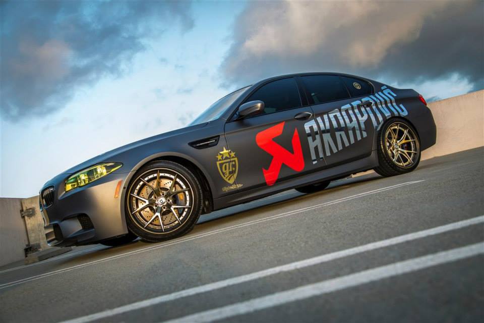 This is the very car in question, boasting the expensive exhaust system and rocking a unique wrap that makes it stands out among all the crazy hyper cars that have come to this year’s event. Akrapovic BMW M5 also gets aftermarket HRE wheels and modified lights to match overall design.