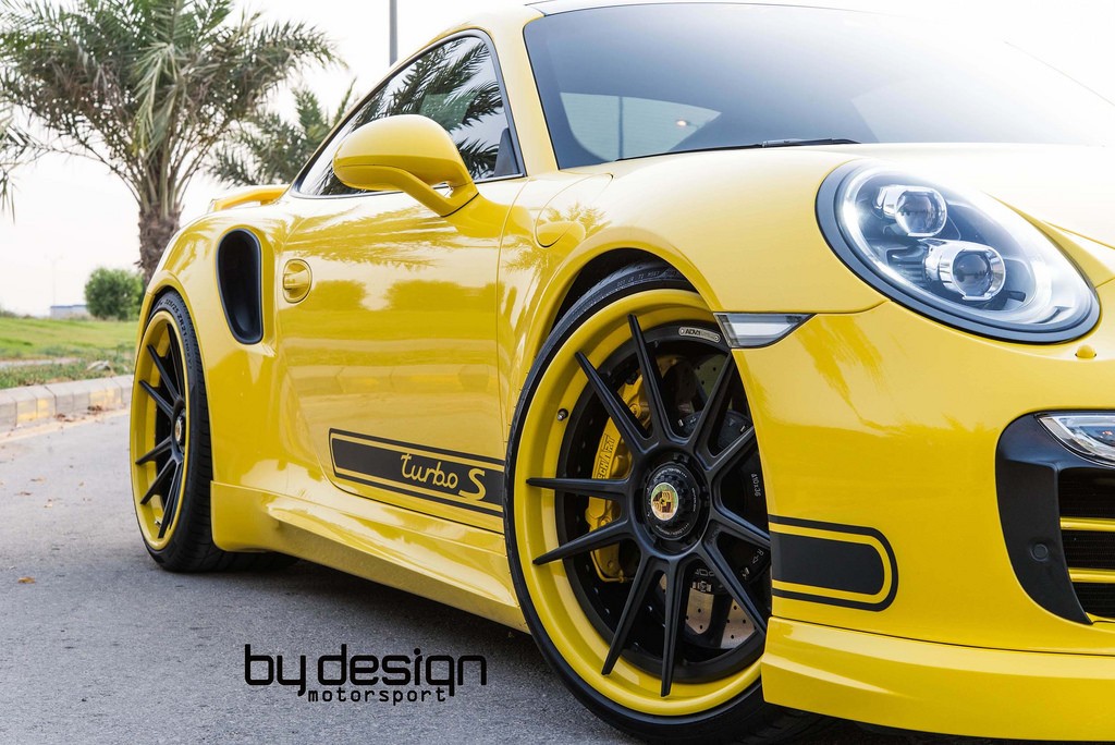 ByDesign Porsche 991 Turbo S is equipped with a set of ADV5.2 TS SL finished in matte black with race yellow lips to match the style of the car. They measure 21×9.5 inch up front and 21×12.5 inch out back.