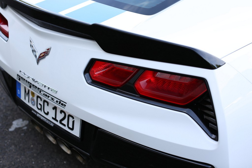 Geiger Corvette Stingray is based on a C7 Coupe which receives a visual upgrade including a special paint job inspired by the C6 427 Anniversary Edition, featuring a white base and two blue stripes.