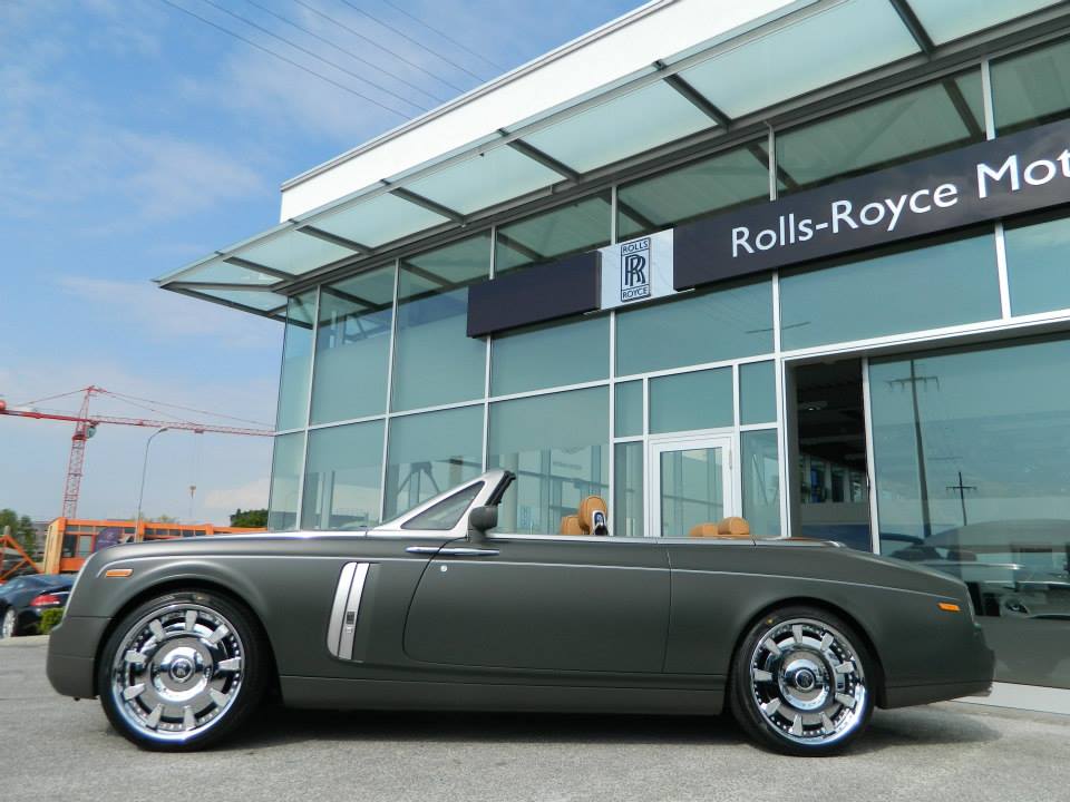 This matte green Rolls-Royce Drophead benefits from a two-tone finish, with brushed aluminum bonnet and side vents. The interior features caramel-colored leather complemented with dark walnut wood. The wheels are also special to this model.
