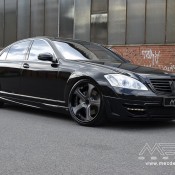 MEC Design Mercedes S-Class W221 gets the tuner’s 2Face body kit, consisting of front skirt with LED lights, rear bumper with “Extreme” diffuser, side skirts with LED lights, and a rear spoiler. The body kit is complemented with a set of MEC Design meCCon CC3 wheels, which are in turn enhanced by the ELS lowering module.