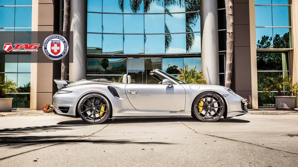 The finest feature of TAG Motorsport Porsche 991 Turbo S is its wheels – a set of 21-inch HRE P101 in satin black with yellow HRE lettering, wrapped in 255/30/21 and 325/25/21 Pirelli PZero tires.