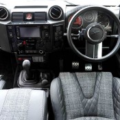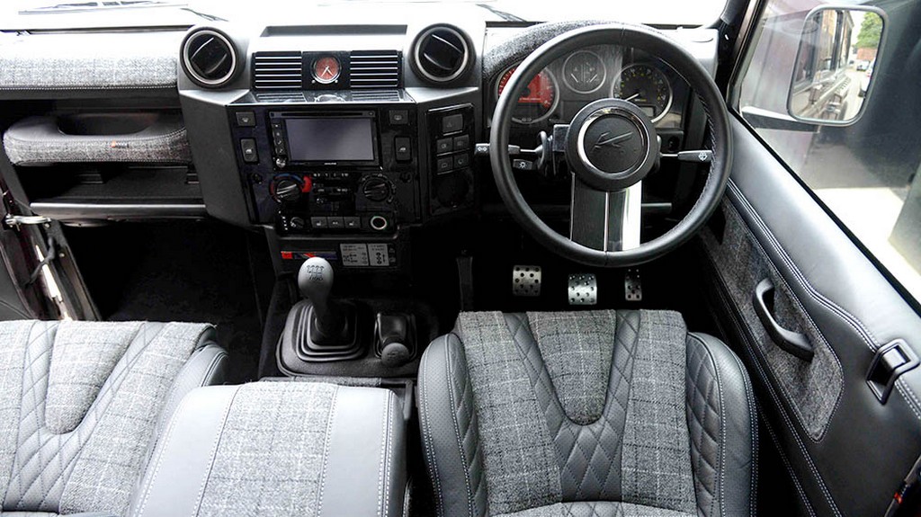 The interior package includes front sports GTB, middle bench and rear folding seats in quilted and perforated leather with Harris Tweed detailing, centre glove box, rev counter facia in red, centre dashboard surround, Kahn single spoke leather steering wheel, rev counter facia, dashboard and instrument binnacle, hard wearing front and rear cabin floor mats, Kahn fire extinguisher, Churchill time clock facia insert and vented foot pedals in machined aluminium. As always, you can customize the interior and choose every last detail yourself.