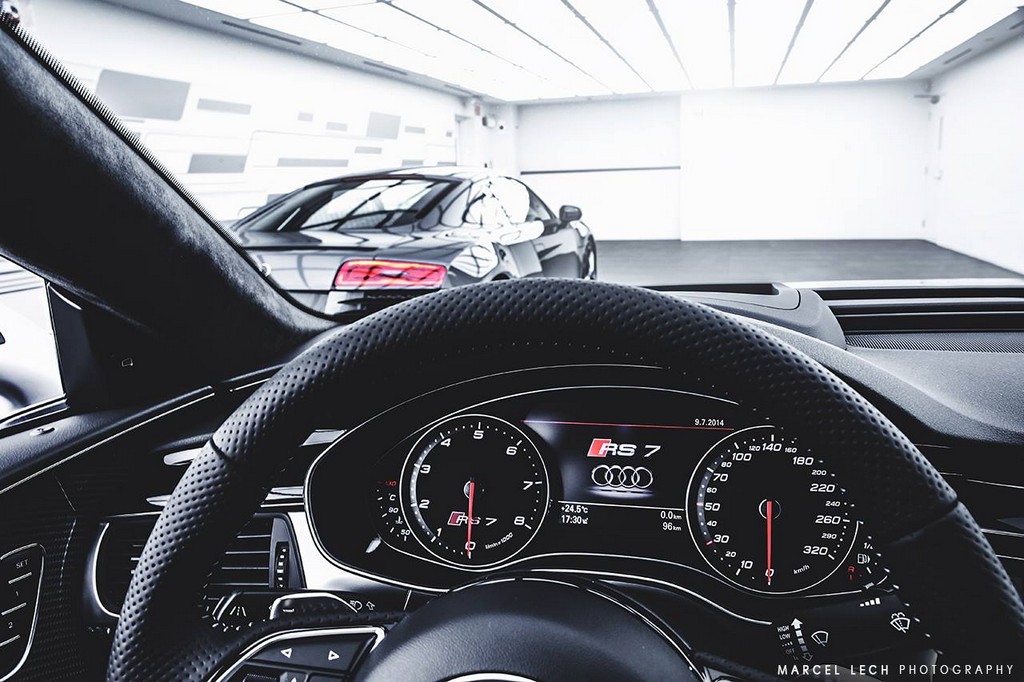 Audi R8 comes with a 5.2 liter Lamborghini-derived V10 engine developing 525 horsepower, while the RS7 gets a much newer and much more efficient 4.0 TFSI V8 with 560 hp and 700 Nm. Both cars have Quattro four-wheel-drive system, and both feature one of the best dual-clutch transmissions in the world. The R8 can be had with a V8 engine and manual gearbox, but the RS7 comes in one flavor.