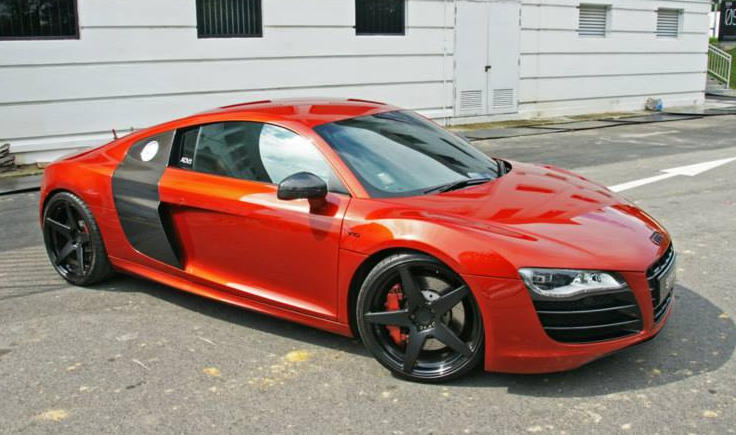 KBS’s R8 V10 does get a couple of visual mods here and there, but there are fairly subtle and mostly obscured by the nice color combo of sakhir orange for the body (not the original color) and matte black for the wheels. The car gets visible carbon fiber side blades and mirror caps courtesy of Hofelle Design.