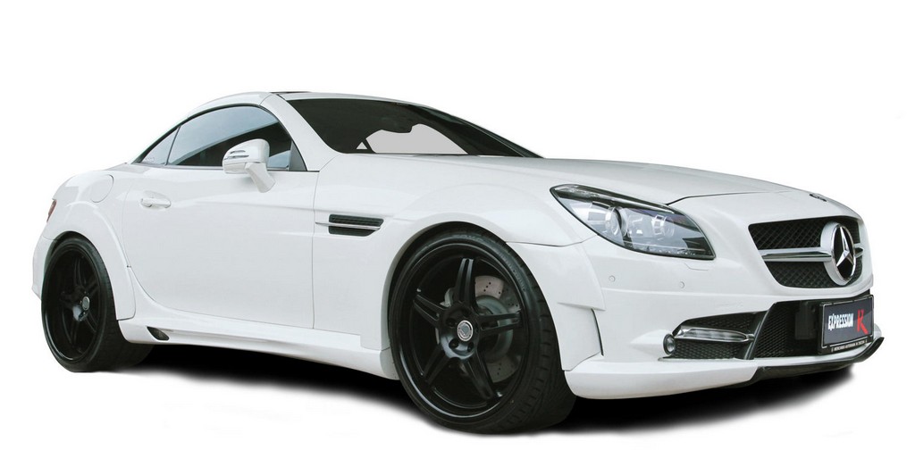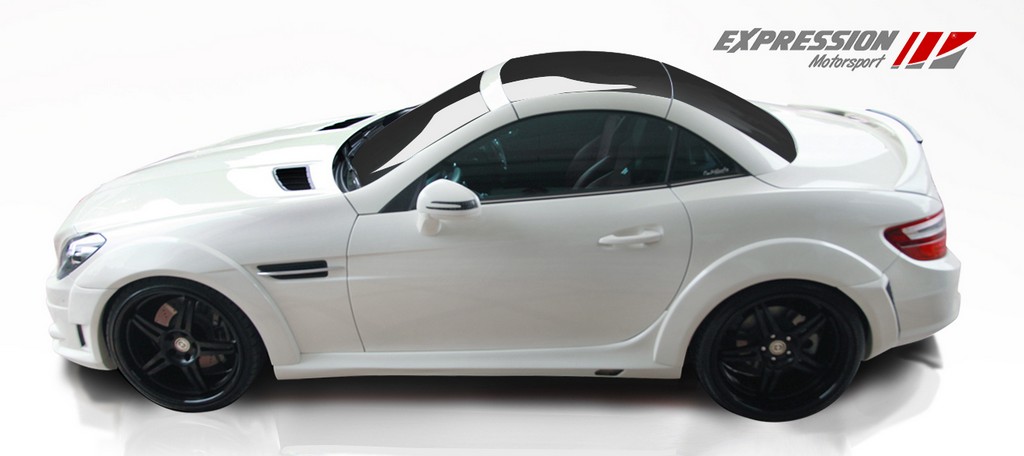 Expression Motorpsort Mercedes SLK styling package consists of R style front bumper, side skirts set, wide Body rear bumper with carbon diffuser, dual exhaust pipes set, trunk wing, 8-piece fender flares set, LED indicators and Micro DE fog lights.
