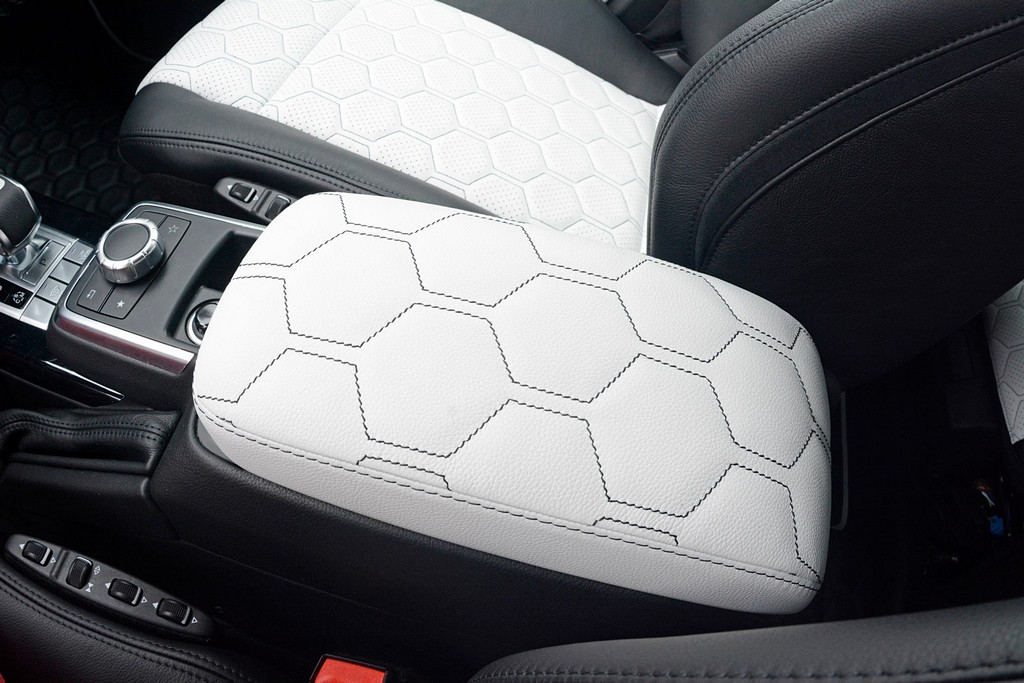 Bilzerian’s Brabus G63 6×6 is finished in white and features exposed carbon fiber elements including hood scoop, fender flares, and mirror caps, plus matte black grille, bars, and safety guards. The best feature of this car, however, is the interior, which features a unique black and white upholstery with contrasting hexagon stitching on the seats, door panels, arm rests, even floor mats.