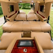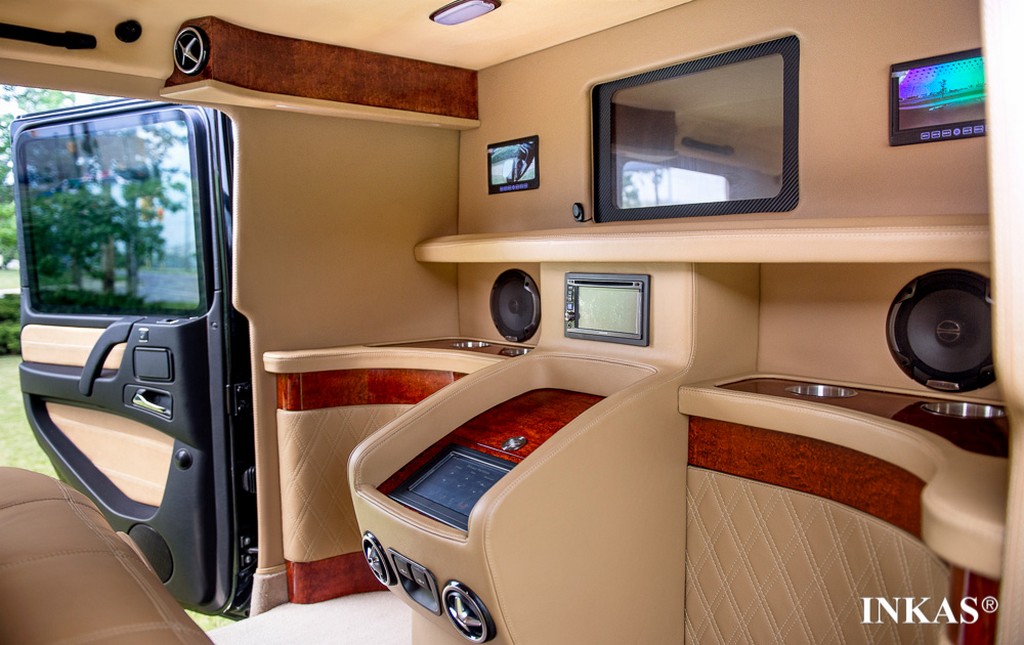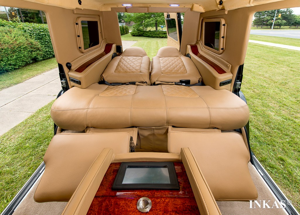 This is a production of Canadian firm INKAS Armored Vehicle Manufacturing who. Right off the bat they stretched the G63 and added 60 inch to its length so they have enough room to go nuts with. And nuts they went indeed, turning the back of this car into a high-class business lounge.