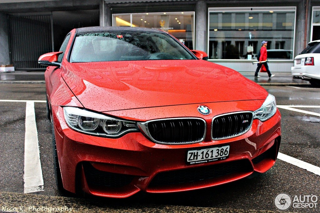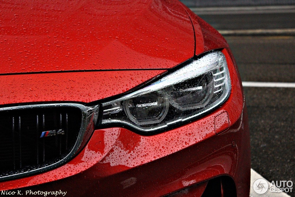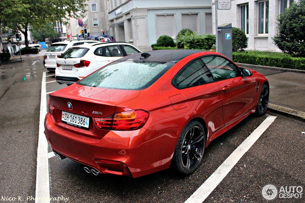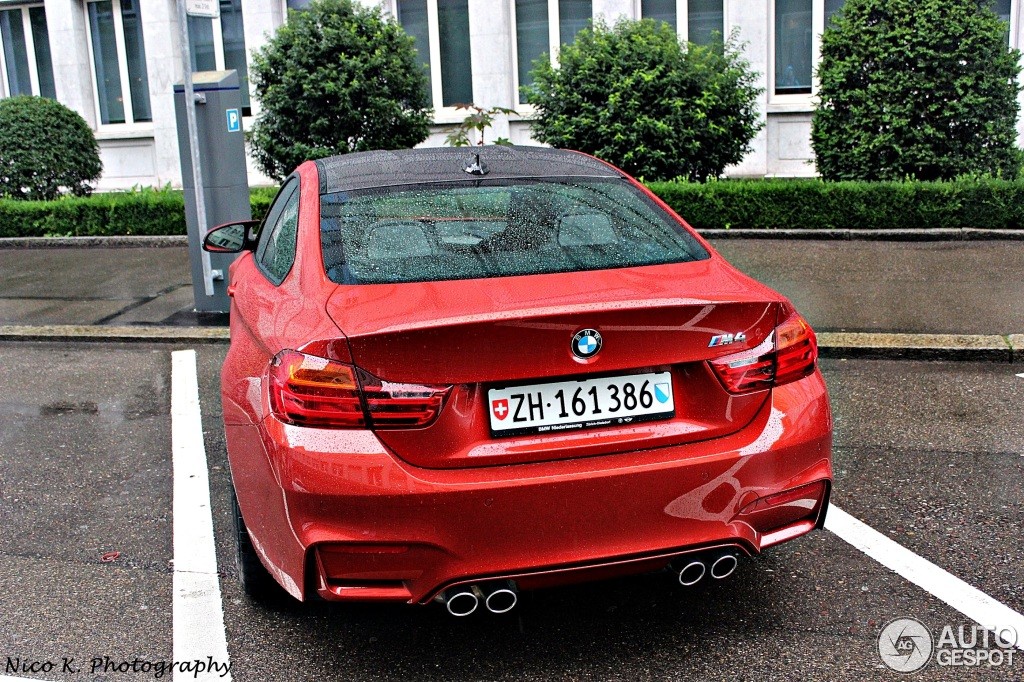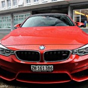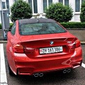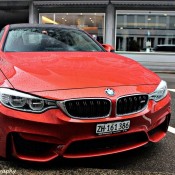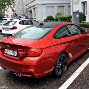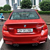 According to the official BMW M4 configurator, this color is called Sakhir Orange, even though it looks more red than orange. At any rate, with the gloss black wheels and the carbon fiber roof, Sakhir Orange BMW M4 is the stuff that dreams are made of!
