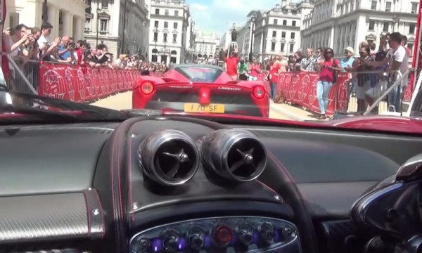 Here we see a LaFerrari storming through London while being chased by a Pagani Hauyra. Thanks to supercar spotter 458MRP, you can go for the ride in the Pagani: