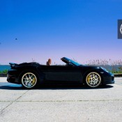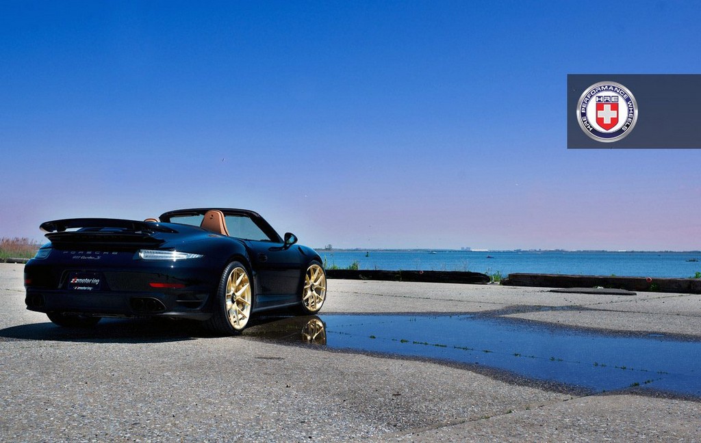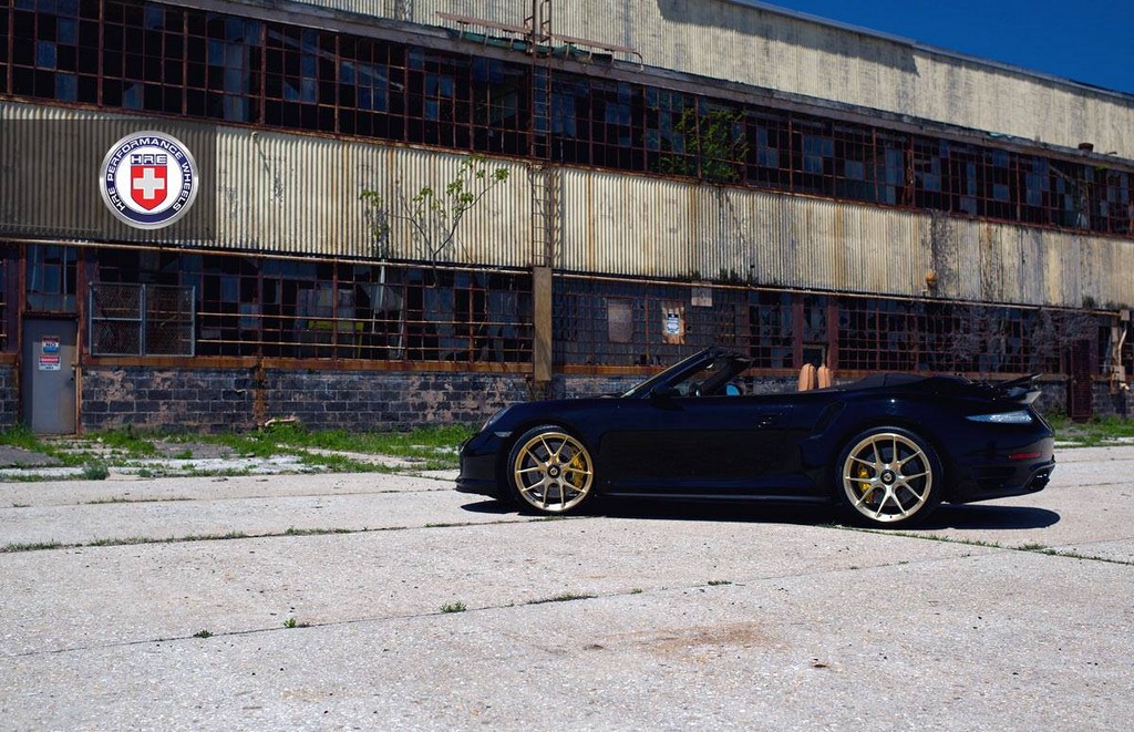 These brushed gold HRE Wheels is showcased here on a Porsche 911 (991) Turbo cabriolet in black; a color that helps the wheels stand out. The rims belong to HRE P101 series and boast a wide five double-spoke design that does a good job of showing off the car’s yellow brake calipers and carbon ceramic discs. Yellow calipers on a Porsche are a telltale sign of ceramic brakes option.