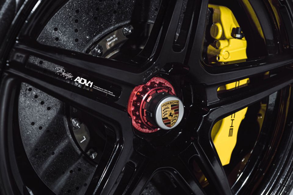 Measuring 19-inch up front and 20-inch out back, the ADV05 rims on this Porsche Carrera GT feature the original center locks and Porsche caps. The combination of the gloss black for the rims, red for the locks, and yellow brake calipers result in a pretty unique look.