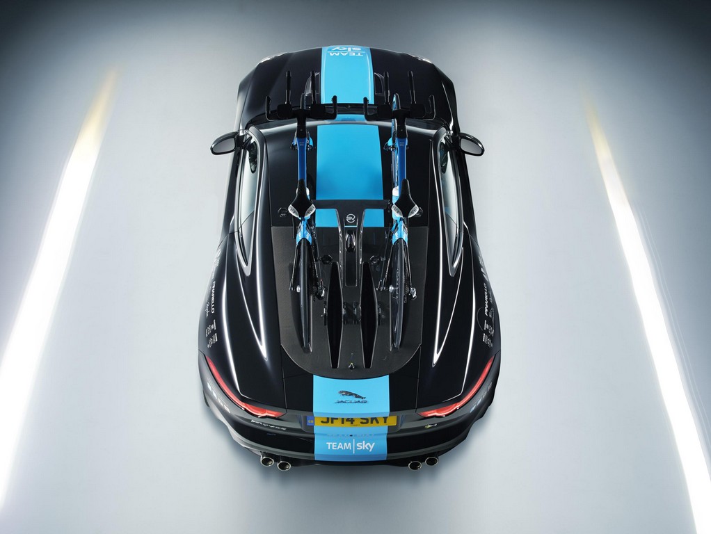 It’s a Jaguar F-Type Coupe, the high-performance V8-powered R version, converted to carry two of the team’s most high-end bikes. The vehicle exterior is finished in Team Sky’s famous livery, with colourways and other Team Sky graphic design.