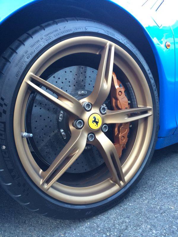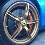 The blue paint job on this Ferrari 458 Speciale is complemented with a two-tone stripe in white and gray, and a set of matte gold wheels and bronze brake calipers. That is a pretty unique combination and one that looks both sporty and elegant.