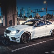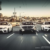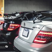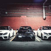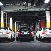 We have three Black Series C63s here, two white and one matte black, all equipped with the full aero kit consisting of front splitter and winglets, and rear spoiler. All these bits are of course made from carbon fiber and besides having positive aerodynamic effect, they also give the C63 a unique look.