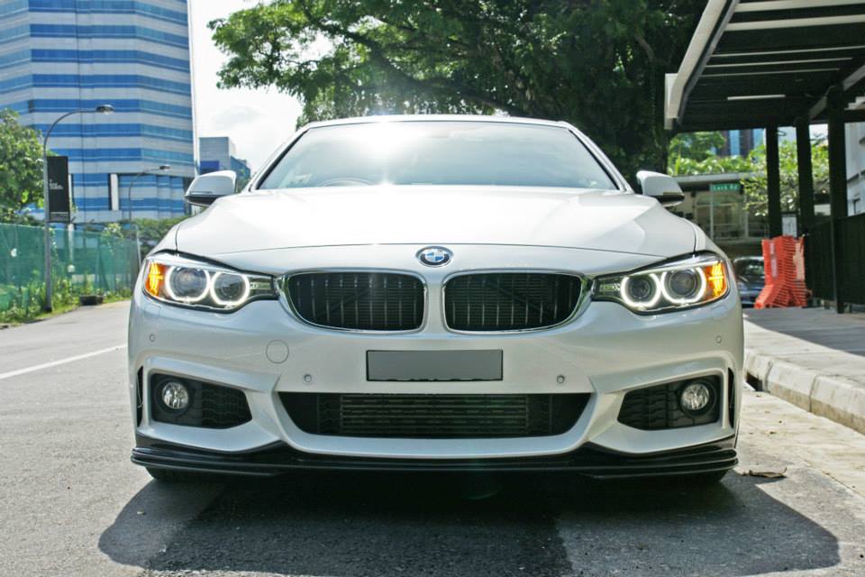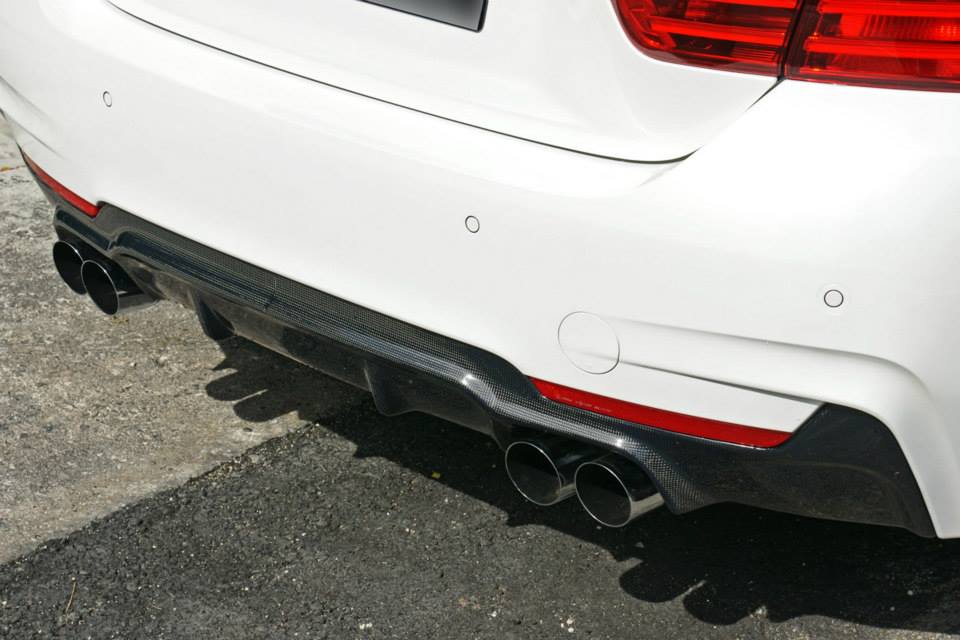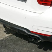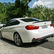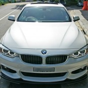 KBS Motorsport BMW 435i shown here features a carbon fiber body kit by Japanese tuner 3D Design, consisting of front spoiler, side skirts, rear diffuser with quad outlet, trunk spoiler and roof spoiler. The kit fits on the 4er’s stock bumpers and sills and give it a lower, sportier stance.