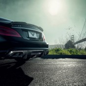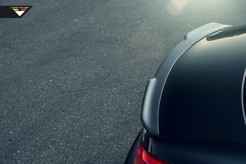 On the outside Vorsteiner Mercedes CLS63 AMG benefits from PrePreg carbon fiber aero parts including a front spoiler, a rear diffuser, and a decklid spoiler. What’s cool about these parts is the design. They match the stock AMG bumpers on this CLS very nicely. What’s more, exposed carbon accentuates the Obsidian Black finish of the body and makes it pop.