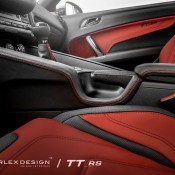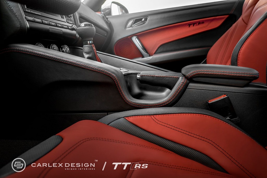 Carlex Design Audi TT RS benefits from a full nappa and perforated leather treatment that not only looks awesome, it feels great to touch and also smalls nice. Red is the dominant color for the seat upholstery, garnished with a unique pattern and black inserts. You will find the same style on the door panels.