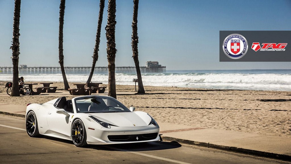 The Ferrari 458 Spider in this shoot is white one which goes really well with the whole beach and summer theme. More importantly, though, it features a set of satin black P101 HRE Wheels which is kind of the highlight here.