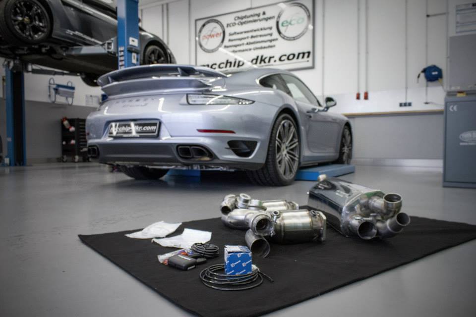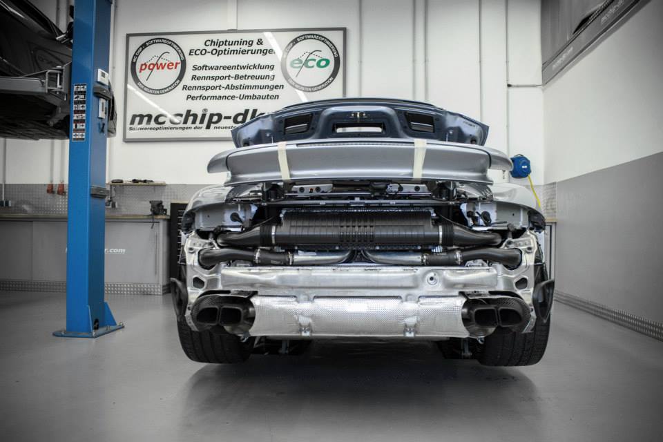 But the program you really want is Mcchip-DKR Porsche 991 Turbo S stage 2, which includes a beefier software optimization plus the aforementioned sport exhaust system. This package costs a whopping 10,000 Euros, but it delivers 620 horsepower and 820 Nm of torque.