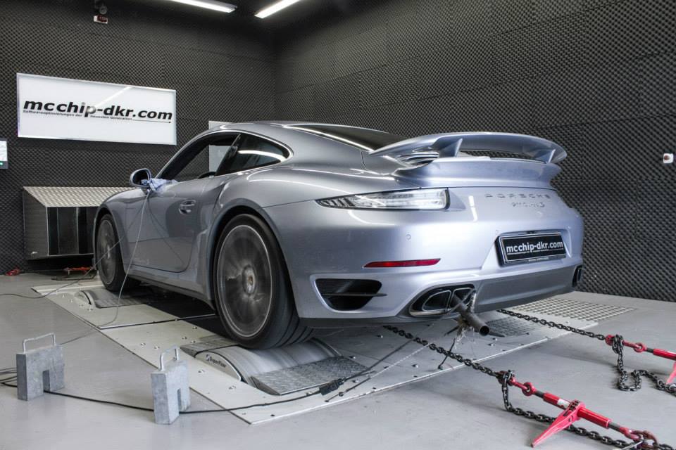 The chained monster you see above is a Porsche 911 (991) Turbo S freshly tuned by Mcchip-DKR and strapped to the dyno machine to reveal how much power it makes. The tuner offers a couple of stages of upgrade for the flat-six engine in this car, the most potent of which is good for an extra 100 horsepower.