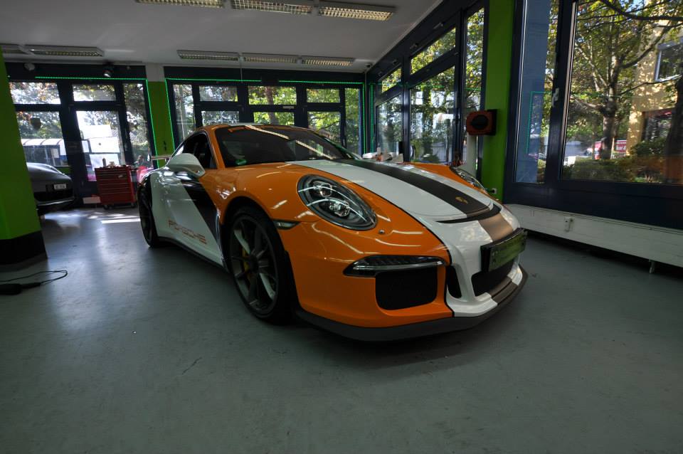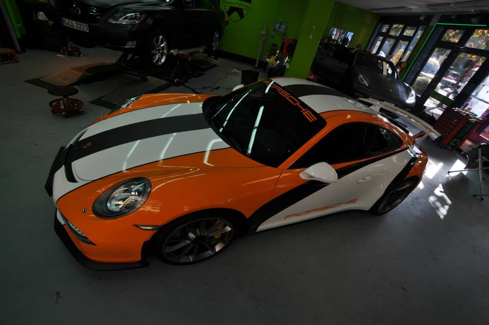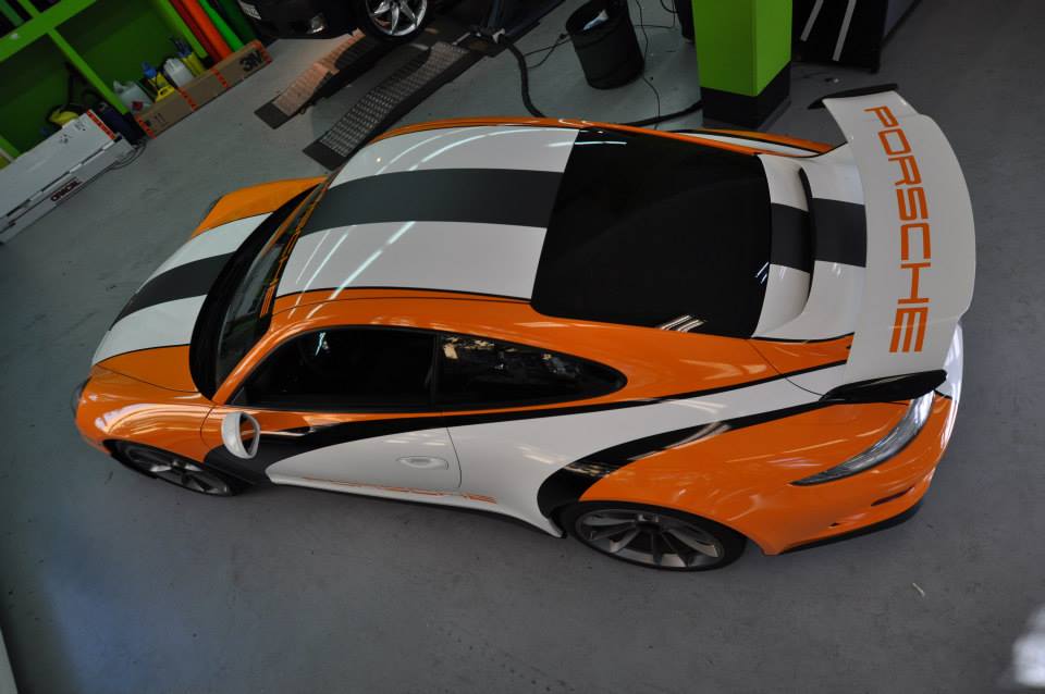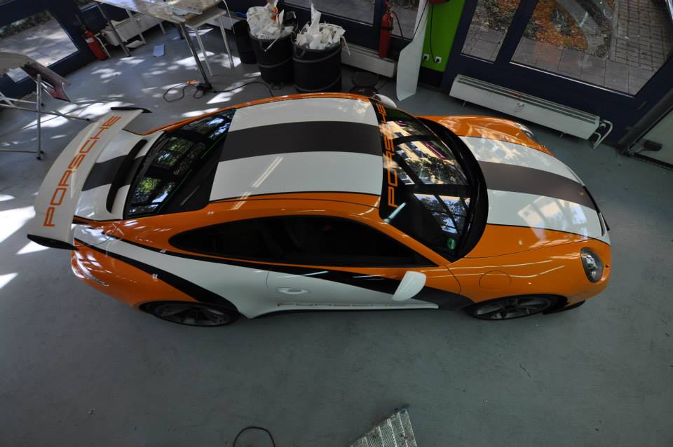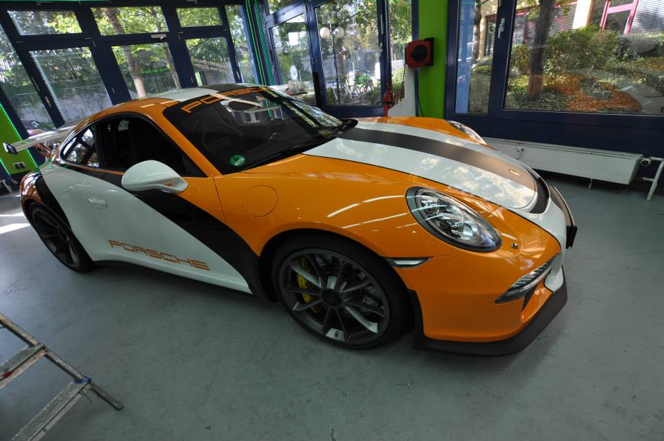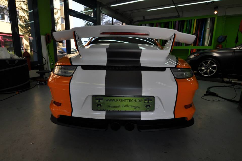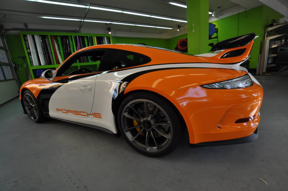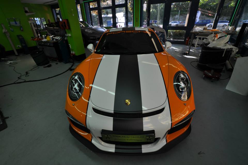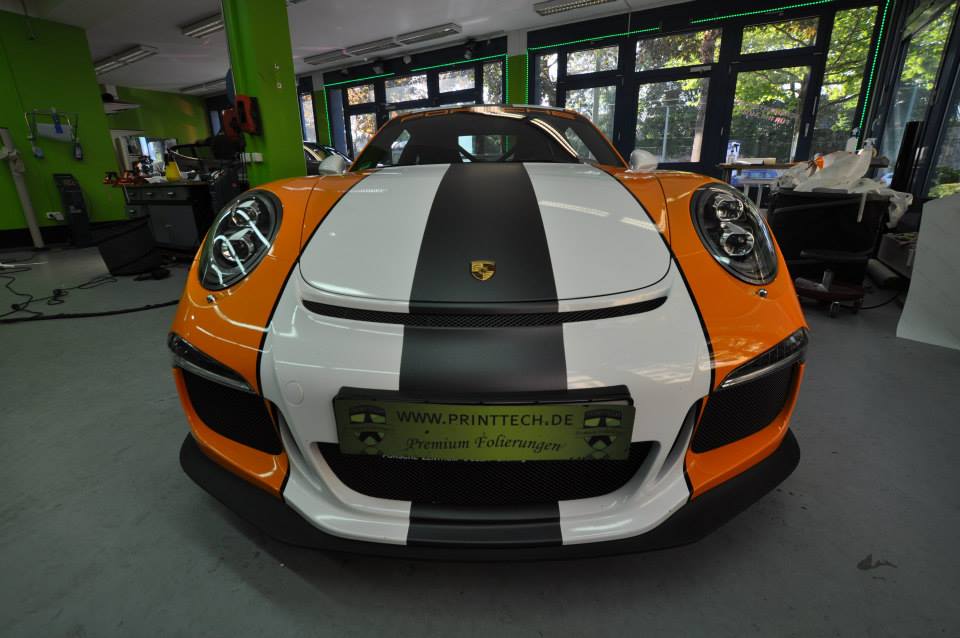 Print Tech’s new project is a Porsche 991 GT3 to which they have given a special wrap inspired, by the looks of it, by the Porsche 997 GT3 R Hybrid. It has the same sort of three-tone livery with a white base garnished with orange on the sides and a black stripe down the middle.