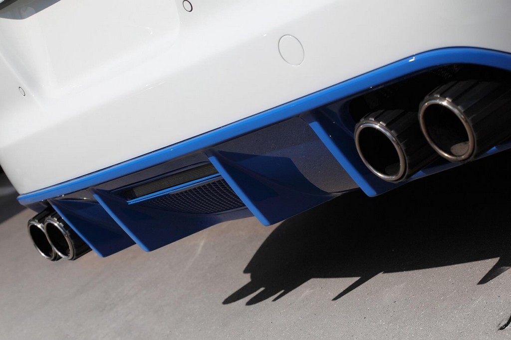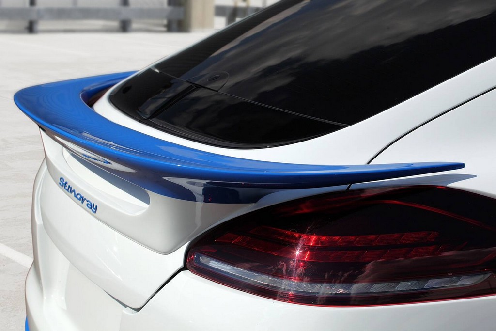 The evolution of TopCar Porsche Panamera Stingray styling package continues with the launch of this, the Blue version. The car is actually white, but detailed with blue accents which give it a very unique look. The ingredients of the kit itself are the same as before.