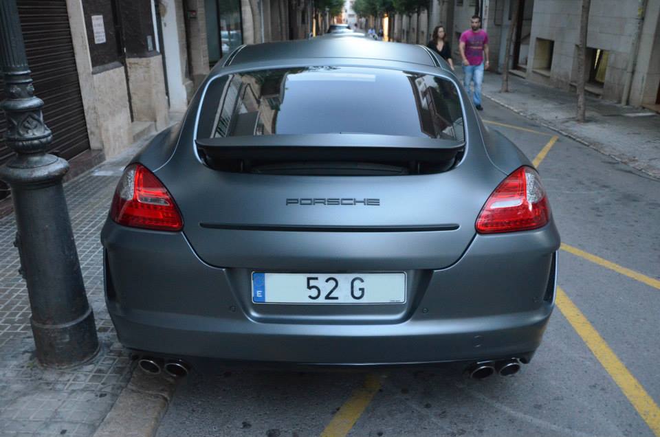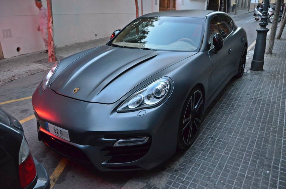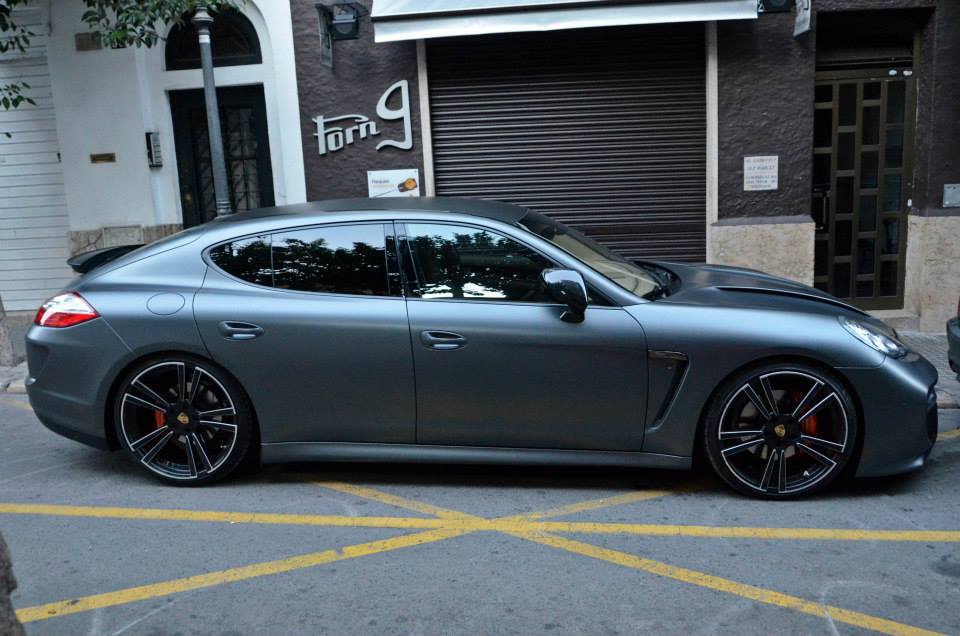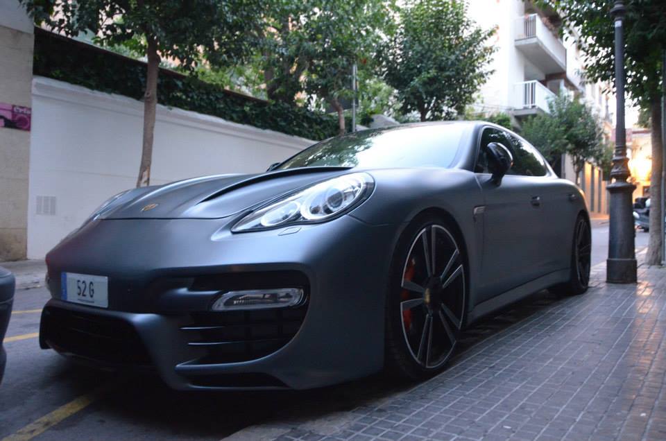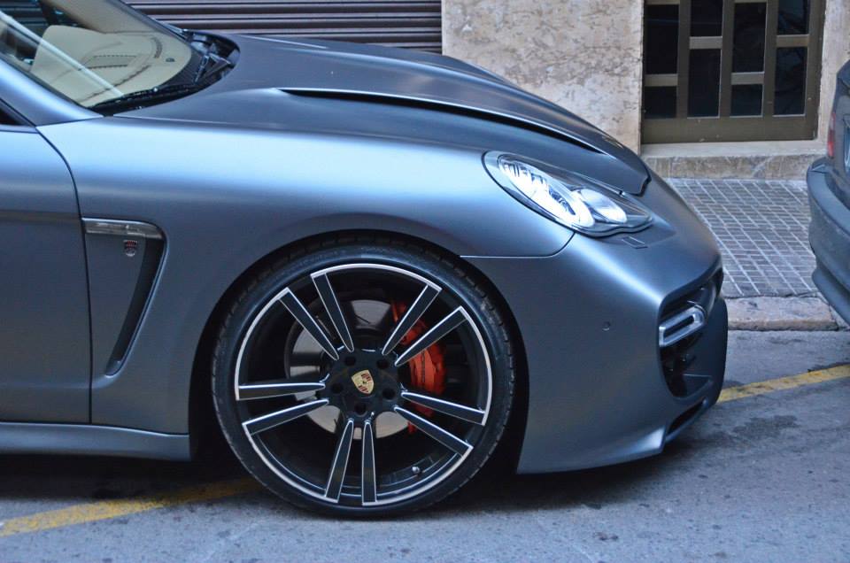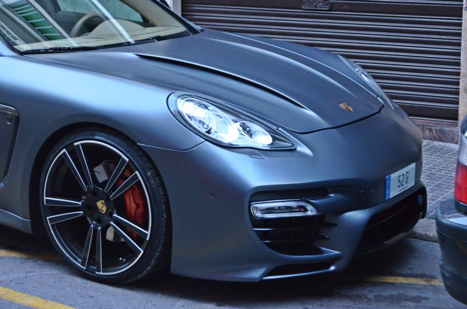 The ingredients of the well-designed Caractere Exclusive Porsche Panamera kit include new front and rear bumpers, distinctive chin spoiler, sport bonnet, side vents and tailpipes. This car is apparently content with the stock diffuser, but benefits from a very sexy matte grey wrap and custom Porsche wheels.