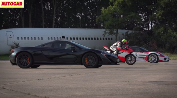 So Autocar becomes the first magazine to stage a Porsche 918 vs McLaren P1 test, and they begin, as usual, with a drag race. They wanted to include the Ferrari LaFerrari in this test, but the Italians didn’t want to take part. So they replaced the Ferrari with something else red, fast and Italian, a Ducati 1199 Superleggera.