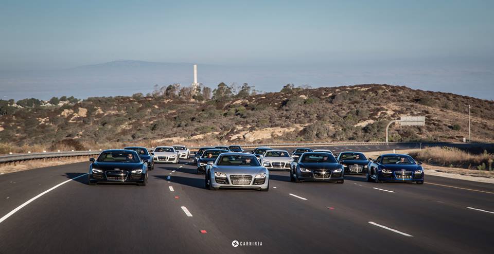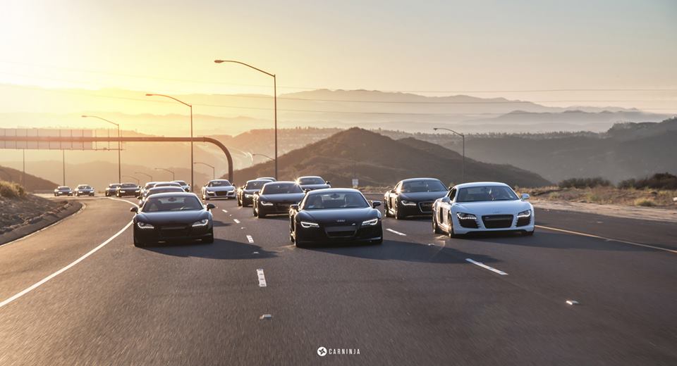 The huge Audi R8 convoy the guys put together include various V8 and V10 models, some of them tricked-out with body kits and aftermarket wheels. What strikes us as kind of odd, though, is that all of the R8s here are hardtop models and all of them feature sober colors like grey, black, white and dark blue.