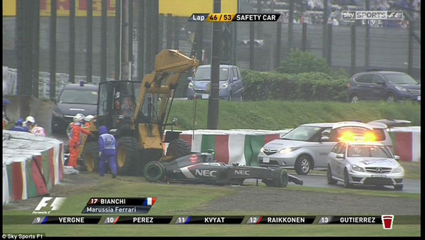 Masamichi Miyazaki, a spokesman for the Suzuka track, claimed the collision was not down to anything but bad luck and that Sutil’s accident had been covered in waved double yellow flags, meaning cars had to lift off enough to be prepared to stop. This is very well, but could the circulating cars see these flags in such poor conditions? Did Bianchi see these warning flags in time to lift off?