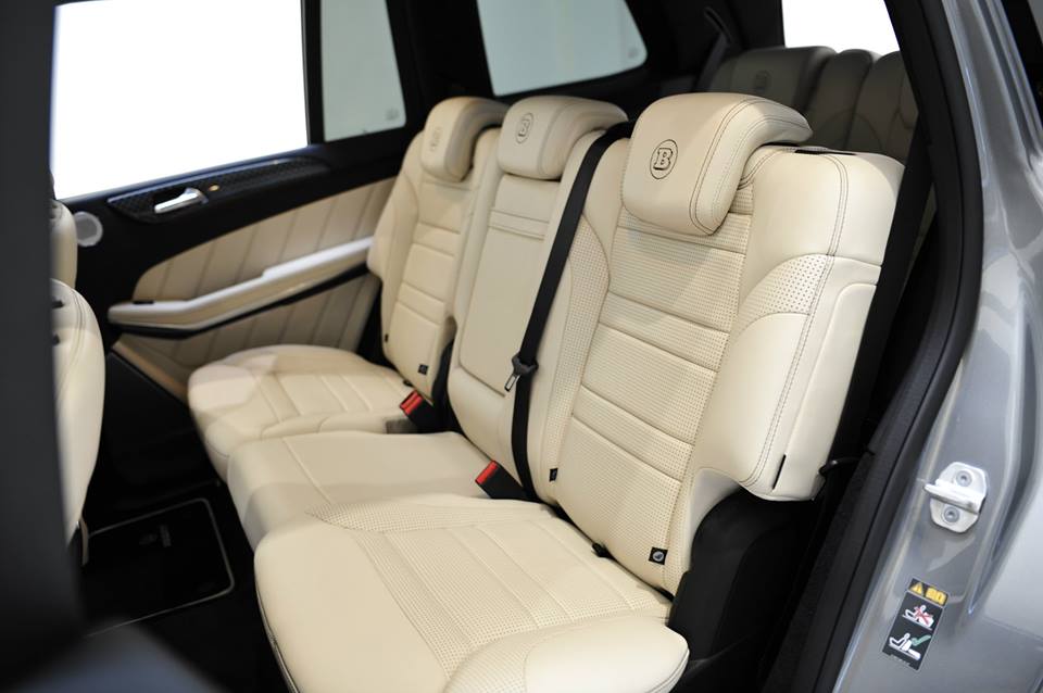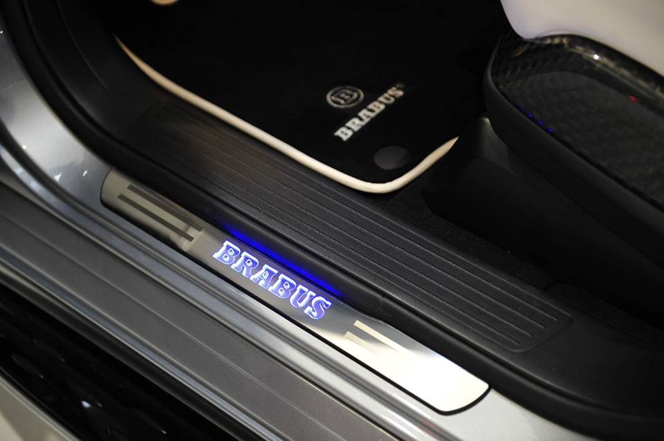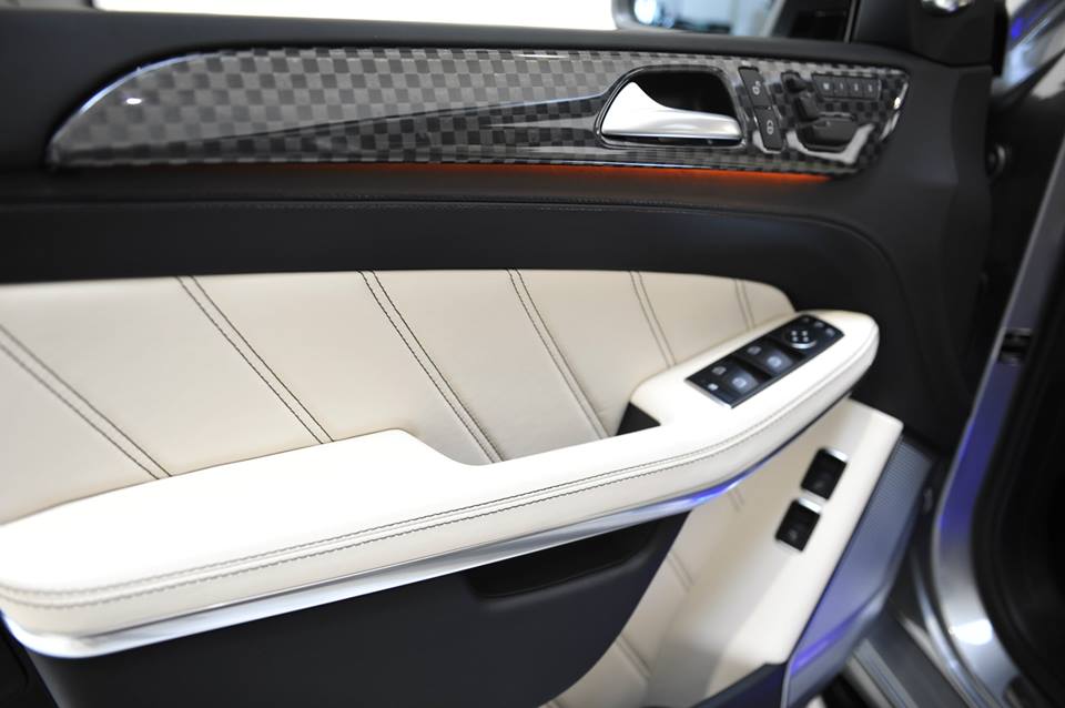 Inside the cabin of this Brabus Mercedes GL63 Widestar you find plenty of fine white leather decorated with contrast stitching, checkered carbon fiber trim pieces, Alcantara-accented steering wheel featuring new paddle shifters, exclusive floor mats with leather edge, and illuminated sills.