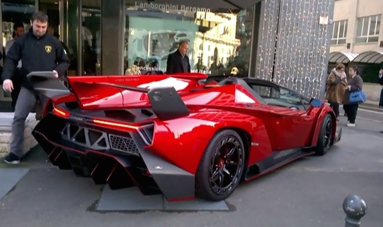 A red example of the super rare, super expensive Lamborghini Veneno Roadster was spotted by supercar hunter Marchettino on the streets of Milan. Marchi caught the car as it was being unloaded into the Lamborghini Bergamo Showroom, so there is no exhaust note and fly-bys here.
