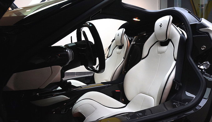 The matte white LaFerrari at Seven Car Lounge seems to be a special order created by the Tailor Made department, as it features non-standard white leather sits with contrast piping and stitching. That is about all you can customize in LaFezza’s cabin, as it’s pretty spartan. But the white seats make a big difference in the way the car looks when those glorious butterfly doors are open.