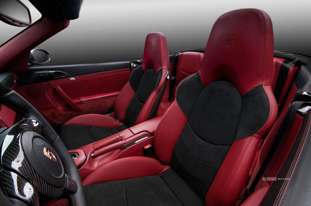 For the interior, Viner decided to keep the original red and black theme, but change the materials to soft Nappa leather and Alcantara. What’s more, the consoles and door cards are now garnished with carbon fiber trim pieces, as is the sport leather-wrapped steering wheel. The seat upholstery features red leather on the bolsters and black Alcantara in the middle, adorned with Porsche logos embossed on the headrests.