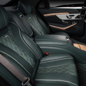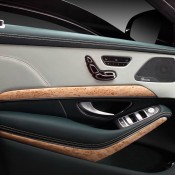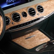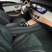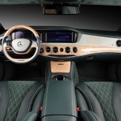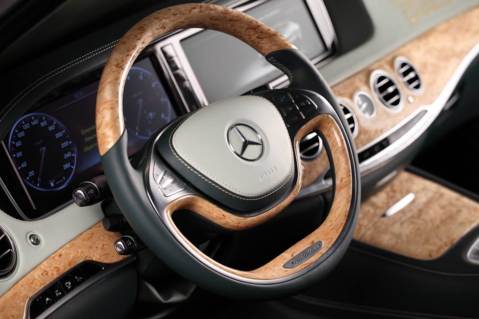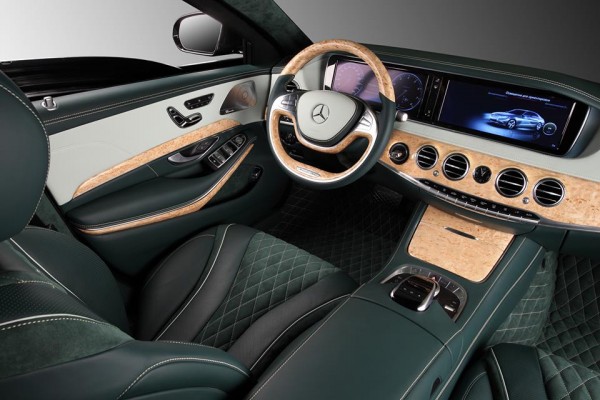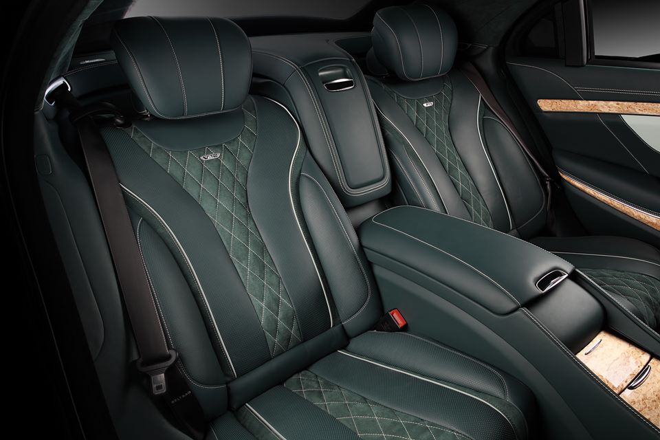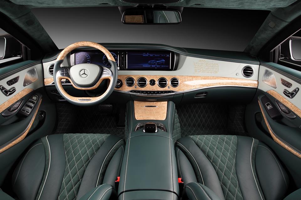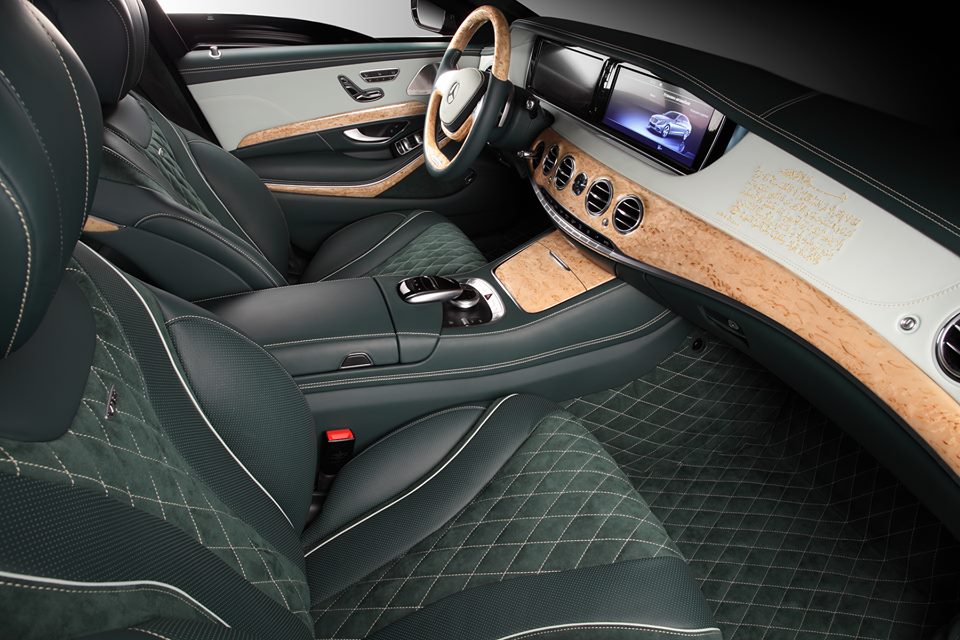For this S600 Guard, TopCar has come up with exclusive design featuring Nappa leather emerald green and Alcantara produced exclusively for this car, Karelian birch decorative panels, and golden accents on the dashboard and the roof.