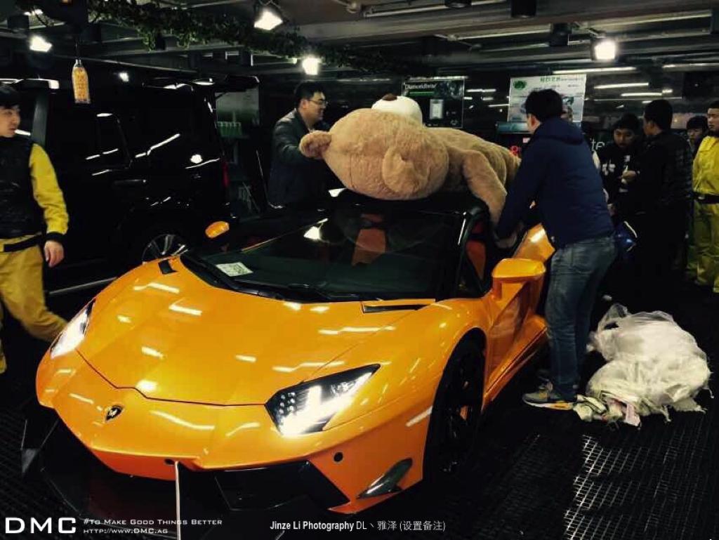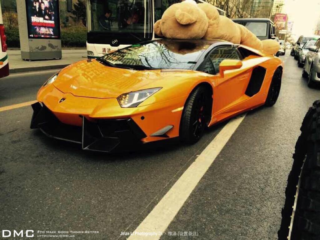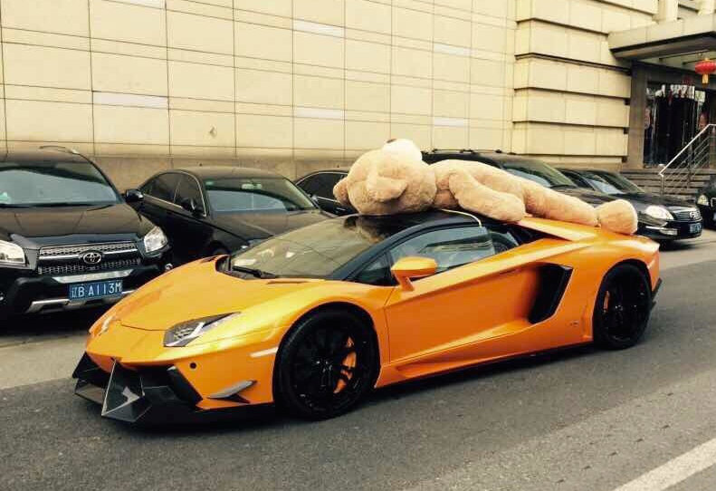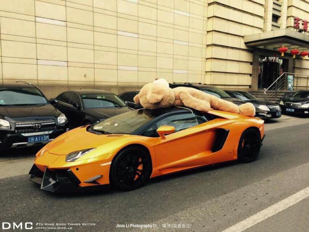 China is a weird and interesting place, but even by their standards, this is something truly outlandish. The owner of a super hot DMC Lamborghini Aventador, which appears to be the coveted E-GT model, decided to strap a giant teddy bear on the roof and drive around town. for funsies!