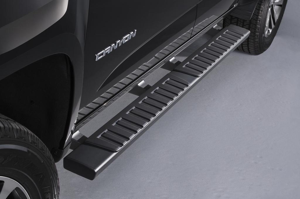 Offered on SLE crew cab models, either 2WD or 4WD, the 2015 GMC Canyon Nightfall Edition comes only in Onyx Black and adds to the standard car a black grille, black assist steps, spray-in bedliner, 18-inch multi-spoke aluminum wheels with Dark Argent painted inserts, and polished exhaust tip.