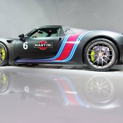 The Martini colors are part of the optional Weissach Package for the Porsche 918 Spyder. It is one of the classic racing liveries Porsche offers for their hybrid hypercar, and probably the coolest of them all. It also looks brilliant paired with a white exterior.