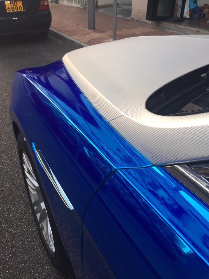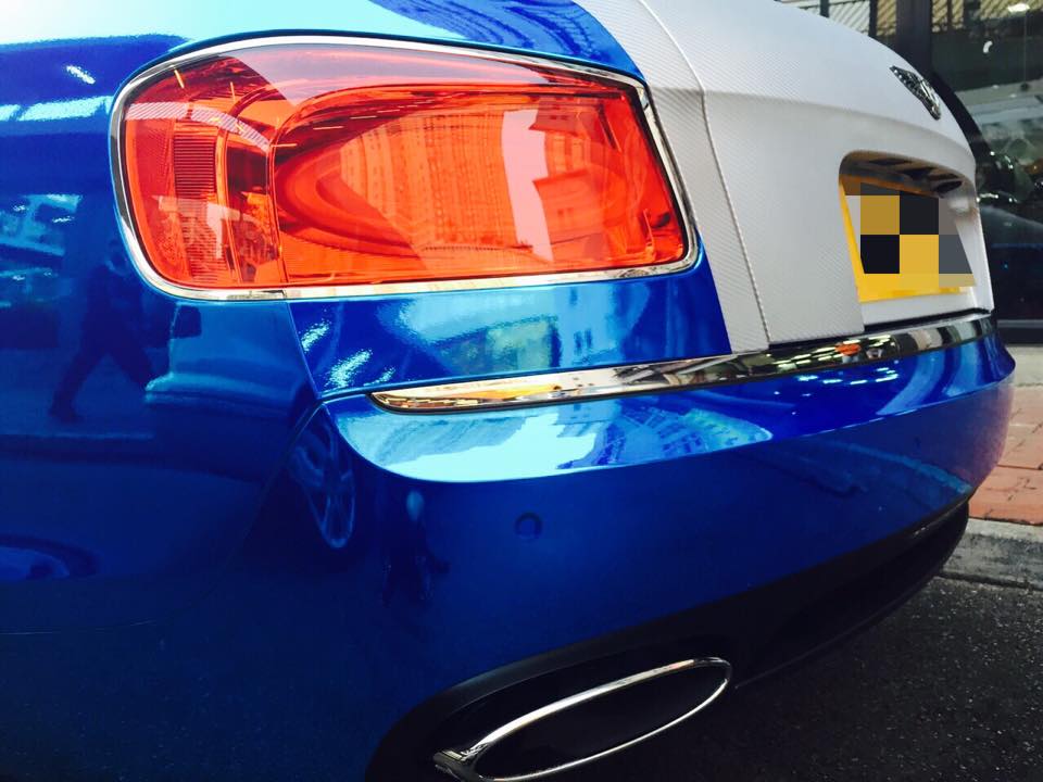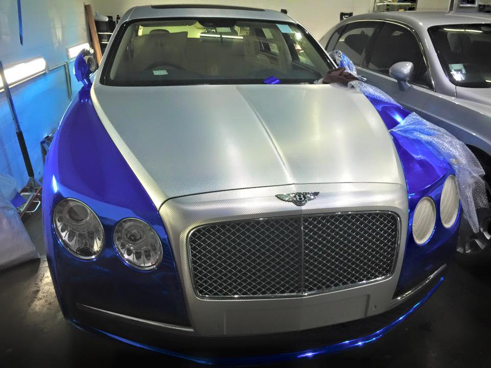 The Bentley Flying Spur here actually gets a two-tone wrap. Complementing the chrome wrap is an equally impressive blue chrome wrap which is very special in its own right. But it’s been done before and next to the chrome carbon wrap it doesn’t really warrant that much attention.