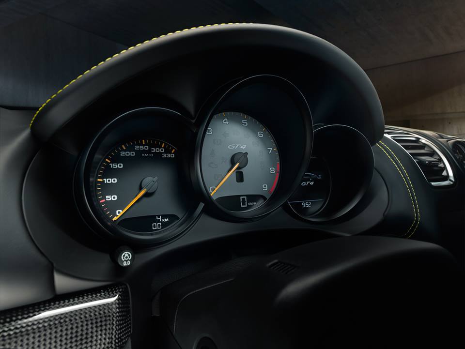 The Porsche Cayman GT4 being a true driver’s car, the cockpit is built around the driver. Everything is within his easy rich, while the passenger is left only with grayness of the dashboard in front of him, interrupted only by a strip of polished aluminum (or optional carbon fiber).