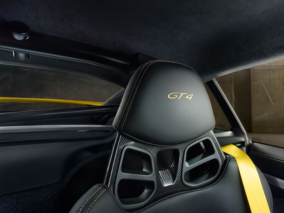In true Porsche fashion, the dials and instruments are pretty sober in design and easy to reap, while the six-speed manual gear lever features a cold metal ball on the top that encourages high-spirited driving. Another highlight of the GT4’s interior is a large infotainment screen that works in tandem with the Sports Chrono package for recording lap times and stuff. The embossed Porsche logo on the center armrest is also something to appreciate.